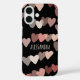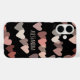 Niedliche, gürlich personalisierte iPhone Gehäuse mit handgemalten Herzmustern. Weibliche Farbtöne, böhmisch-böhmische Nuancen von Rosa, Puder, Elfenbein, Bräune, staubige Terrakotta für die Herzen, die Pop aus dem eleganten schwarzen Hintergrund. Anpassbar mit Namen, z. B. oder Initialbuchstaben, falls gewünscht. Modisch angesagtes Accessoire zum Schutz Ihres Handys oder ein kreatives originelles, nachdenkliches Geschenk für sie. Zu einem sehr erschwinglichen Preis, unter 50 Dollar.