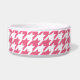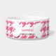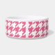Diese Keramikhundenahrungsmittelschüssel hat ein stilvolles rosa und weißes Hahnentrittmustermuster im Hintergrund. In der Mitte gibt es einen großen weißen Knochen mit einem leicht kundengebundenen Namen Ihres Hündchens, das in Rosa geschrieben wird.
