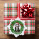 Niedlicher Personalisierter Schwarz-Weiß-Cartoon Bernedoodle Welpe mit maßgeschneiderter Weihnachtsmannmütze, roter Bogen mit Klingelglocken, in Weihnachtsbeleuchtung geknackt. Festliche Weihnachtskranzgrenze. Fügen Sie Ihrem Bernedoodle den Namen zu diesem bezaubernden Urlaubspapier Schneeflocke!