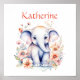 Babyzimmer Kunst mit einem niedlichen Wasserfarbelefanten, umgeben von rosa und korallenfarbenen Blume. Geben Sie im personalize-Bereich den Namen ein.