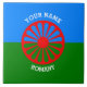 Personalisierte offizielle Romany-Sinti und Romareisendflagge, O Styago le Romengo in romani, der Rom-Zigeuner mit einem roten Lastwagenrad auf einem grünen und blauen Hintergrund. Diese moderne Flagge stellt den blauen offenen Himmel und das grüne Gras der Welt mit einem Rad der Reise und des durchstreifenden Lebens der Sinti und Roma dar, dargestellt durch ein shakra das Rot mit 16 Speichen. Personifizieren Sie leicht dieses mit Ihrem eigenen Text, Namen oder Monogramm zu den NamensVorlagen, um ein einzigartiges kundenspezifisches Geschenk für jemand von stolzem Romany-Sinti und Romaerbe oder von kulturellen Wurzeln herzustellen. Oder besichtigen Sie den KUNDENGEBUNDENEN GESCHENK-SPEICHER für zusammenpassende Produkte und mehr Sinti und Romareisendgeschenke.