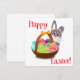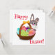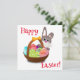 Ein Ostersonniger flüchtige Blick hinter einem Korb voller Ostereier. Eines der Eier hat einen persönlichen Namen, der leicht zu bearbeiten oder zu entfernen ist. Auch der Schriftart, die Farben und die Farbe der Karte selbst können leicht verändert werden.
