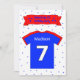 Diese lustige 7. Geburtstagsfeier lädt zum personalisierten Text ein. Auf der Vorderseite der Karte befindet sich ein großes rotes Geburtstagsbanner mit der Meldung "Komm zu meiner 7. Geburtstagsparty". Das Shirt ist in Rot und Blau gehalten, die weiße Nummer 7 ist groß, und der Name des Kindes trägt den Namen des Kindes. Auf der Rückseite der Karte können Sie Details zum Party eingeben.