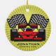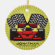 Personalisiertes Rennwagen-Ornament vor einem Hintergrund der Sternexplosion. Alle Texte individuell anpassbar, vorne und hinten!