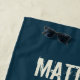 Erstellen Sie ein personalisiertes Strandtuch mit klassischem Surfstil. Es zeigt eine Retroillustrierung der abstürzenden Wellen in Blau mit einer leuchtenden orangefarbenen Sonne darüber und Schlangenmuscheln, die gegen die Sonne silhoutiert sind. Die Abbildungen sind Set vor einem marineblauen Hintergrund. Die Grafik hat einen bedrückten Stil und verleiht ihr ein abgenutztes, Vintages Aussehen. Beängstigende Stilschrift in elfenbeinweißen Zaubern aus Ihrem Namen oder einer anderen Nachricht.