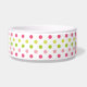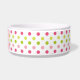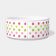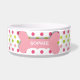 Diese Keramikhundenahrungsmittelschüssel hat ein Rosa, eine Fuchsie und grünes ein Polkapunktmuster im Hintergrund. In der Mitte gibt es einen großen rosa Knochen mit einem leicht kundengebundenen Namen Ihres Hündchens, das in Weiß geschrieben wird.