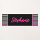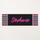 Die Yoga-Matte mit leuchtendem Fuchsienrosa, weißen und schwarzen Streifen und dem Namen in der Länge der Matte in einem lustigen Skriptstil.