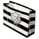 Modernes Design, kühn schwarz-weiß gestreiftes Muster mit kleinen Imitaten goldener Glitzer-Rand und einem handgemalten Blumenkranz aus weiß-rot rosa Rosen mit winterenden Ästen und rosa-weiße Hydrangeas. Ein paar Lavendel Freesias werden auch mit einem sukkulenten Laubhaufen eingesteckt. Eine Typografie-Textnachricht lautet "So viel Glück für euch beiden!" und die Namen von Braut und Bräutigam sind unten personalisiert. Audrey Jeanne Roberts ist urheberrechtlich geschützt.