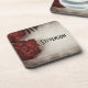 Personalisieren Sie diesen Kunststoff-Untersetzer mit Ihrem Namen in einem Deko Schriftart der schwarzen Kunst. Kühl und elegant. Die Oberfläche ist mit einem Blumenfoto im Herbst gestaltet. Verblendetes Schreibpapier mit hübschen roten Blume und grünen Blätter an den Kanten.