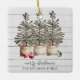 Rustikale Weihnachtsbäume und Saitenlichter schmücken auf einem Holzboden mit Ihrem Familiennamen für Ihre Ferienzeit. Erdig rustikaler Landhausstil. Frohe Weihnachten mit Familiennamen. Elegante Metallverzierungen.