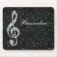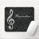 Personalisiertes elegantes bezauberndes girly mousepad, das Sie mit Ihrem eigenen Namen personifizieren können. Schön, Blendungstrendy Druckbildsilber und -diamanten, die musikalische Anmerkung der Juwelen über einen funkelnd Glitter-Druckbildhintergrund des Chicschwarzen bling sind. Ein niedliches, nobles, modernes, stilvolles, hübsches Geschenk für sie oder irgendein Musikliebhaber.