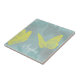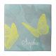 Ein hübsches, gelbes Schmetterlingsmuster über einem blau-grauen grunen Hintergrund mit Aquarellfarbe. Personalisiert mit Ihrem Namen in einem angesagten, weißen Skript.