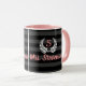 Einzigartige Tasse für Lehrer oder jede Dame mit nüchternem Stil. Eleganter personalisierter trendiger Stil. Breite horizontale schwarz auf schwarzem Striphintergrund mit rosa Schrift und weißem Lorbeerkranz. Fügen Sie dieser personalisierten trendigen Tasse Namen, mit Monogramm Single Buchstaben Initial und Namen hinzu.