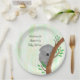 Sleepy Koala Bären themed personalisierte Baby Dusche Papier Teller. Das ist Koala Bär Thema und die Farben sind braun, grün, grau und gelb.
