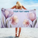 Ummanteln Sie sich mit Stil mit diesem wunderschönen Wasserfarben-Blumen-Strandtuch. Mit zarten lila und pfirsichfarbenen Blüten auf einem sanften Lavendel-Hintergrund bietet dieses Tuch einen ruhigen und eleganten Look. Personalisieren Sie es mit "IHR TEXT HIER", um es einzigartig zu machen oder ein durchdachtes Geschenk zu erstellen. Perfekt für Strandtage, Poolränder, Picknicks oder einfach um Ihrem Zuhause einen Hauch von naturinspirierter Schönheit zu verleihen. Hergestellt aus weichem, saugfähigem Material für ultimativen Komfort und schnelles Trocknen.