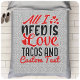 Personalisiert Alles, was ich brauche, ist Liebe Tacos und benutzerdefinierte TEXT oder Name. Imitate Silver Glitzer Hintergrund. Macht ein einzigartiges Valentinin oder JEDES TAGES Geschenk! Passen Sie sich mit Ihrem Lieblingshobby, Beruf oder besonderen Ding in Ihrem Leben an. Lieben Sie Pferde, Frisierte Autos, Motorräder, Fischen, Jagen, klassische Autos, Knittern, Nähen, Whiskey, WIne, Fußball, Golf, Sport? Alles funktioniert!