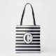 Eine Tasche, die mit einem schwarz-weiß gestreiften Muster versehen ist. In der Mitte befindet sich ein Monogramm-Logo, das mit Ihrem Initial personalisiert werden kann. Dieses Produkt ist ein großartiges Geschenk für jeden Anlass.