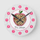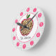 Eine Uhr für die Lehrer, die eine Illustration eines Giraffendruckapfels kennzeichnen, personifizieren mit Ihrem Namen unter Apfel. Uhr kennzeichnet weiße Zahlen auf rosa Punkten.