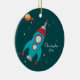 Hat personalisierte runde Keramikverzierung dieses niedlichen Jungen aus diesem Weltraumthema heraus! Der Hintergrund hat eine dunkle aquamarine Farbe mit Losen gelben, weißen und grauen Sternen im Hintergrund. Es gibt ein Raumschiff auf der Unterseite mit einem orange und roten Planeten mit Ringen um ihn an der Spitze. Auf dem Recht können Sie den Namen und das Jahr leicht besonders anfertigen.