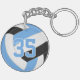 Dieses Schlüsselanhänger mit Volleyball-Motiven für Jungen und Mädchen zeichnet sich durch ein realistisch aussehendes blaues, schwarz-weißes Volleyball aus, auf dem Sie den Spielernamen, die Jerseynummer und die Position des Spielers sowie den Namen der Schule oder des Clubs und des Maskottchens in einem Schriftart im Stil von Katz_d_zynes anpassen können