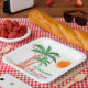 Feiern wir Weihnachten im Juli mit einer GRILLEN oder einem Party! Laden Sie Ihre Familie und Freunde zu einem Weihnachtsfest ein und dekorieren Sie es mit den quadratischen Tellern im Inselstil mit handgezeichneten Palmen, die mit Lichtern geschmückt sind. Einfach mit Ihrem Namen anpassbar. Weil wir unsere eigenen Kunstwerke erstellen, werden Sie dieses exakte Bild von anderen Designern nicht finden. Original Wasserfarbe © Michele Davies.
