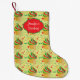 Personalisierter Name Weihnachten Weihnachten Strumpf mit einem Muster mit einem niedlichen Cartoon Gesicht (glückliches Gesicht) Kuchen auf einem hellgrünen Hintergrund mit Herz und Punkten.