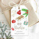 Personalisierte Weihnachtsmarke mit handbemalten Aquarellbildern wie Schlitten, Schneeflocken, Weihnachtsbeleuchtung, eine Tasse Marshmallows, Weihnachtsgrün und weiteren Weihnachtselementen. Weihnachtsgeschenk-Tag. Der gesamte Text ist vollständig anpassbar.