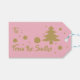 Ein Päckchen rosa Holiday Geschenketiketten mit einem Imitat goldenen Weihnachtsbaum und Schneeflocken auf der Vorderseite , die Sie mit Ihrem eigenen Namen personalisiert werden können. Auf der Rückseite ist ein einfaches Muster einer kleineren Größe des gleichen goldenen Kiefernbaums zu sehen. Suchen Sie nach den Geschenktaschen und/oder Verpackungspapier derselben Sammlung .