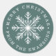 Siegel deine Weihnachtskarten und -geschenke mit diesen festlichen personalisierten Aufklebern, mit einem Fichtengrün-Hintergrund im Urlaub mit einer weißen Schneeflocke in der Mitte, umrahmt von deinem persönlichen Gruß und Namen. Mit "Frohe Weihnachten" gezeigt.