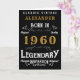 Glücklich zum Geburtstag für die geborenen im Jahr 1960. Fügen Sie Ihren Namen Geburtstagskarte hinzu. Bearbeiten Sie den Namen und das Jahr sowie die Meldung mit der bereitgestellten Vorlage. Eine wunderbare, Vintage und weiße Geburtstagskarte in Schwarz. Diese Karte ist auch in einem riesigen Format für diese wirklich große Überraschung verfügbar. Mehr Geschenke und Party-Vorräte mit dem "Legendary"-Design im Laden erhältlich.