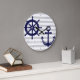 Dieses dekorative Design verfügt über einen dunkelmarineblau anker und ein Helmrad mit grauen und weißen Streifen. Die nautische Illustration schafft eine moderne und einzigartige Wanduhr mit personalisiertem Text und Hintergrundfarbe.