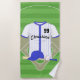 Niedliches Baseballdesign. Auf der Vorderseite ein blau-weiß gestreiftes Baseball-Trikot, das mit einem Namen und einer Zahl, einem blauen Baseballdeckel, Baseball und Baseballschläger individuell gestaltet werden kann. Im Hintergrund befindet sich ein Baseballfeld.