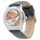 Diese sportliche personalisierte Basketballuhr zeigt das realistische Bild eines Basketballs, der abwechselnd orange und weiß getafelt wurde, mit überlagerten Uhrengesichtsziffern, die den Namen und die Trikotnummer des Athleten leicht anpassen können