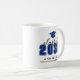 Ein schlankes und modernes Abschiedstassen-Geschenk mit einem Abschlussmützen-Symbol oben in Blau, darunter wird "Jahrgang" und das Jahr angezeigt. Der Name des Absolventen und die Schule erscheinen darunter in sauberen, eleganten Schriftarten und schaffen ein poliertes und stilvolles Design. Das Design umgibt die Tasse auf zwei Seiten und sorgt dafür, dass sie aus jedem Winkel großartig aussieht.