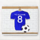 Entwirft einzigartiger Sport mit einem blauen und weißen Fußball Jersey mit einem Fußball, der in einem Umkleideraum hängt, der mit Ihrem eigenen Namen und Zahl völlig kundengerecht ist. Ein ideales personalisiertes Geschenk für irgendeinen Fußballspieler oder Fußballfan.