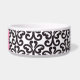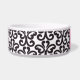 Diese Keramik Hundefutter Schüssel hat ein stilvolles Schwarz-Weiß Damast wirl Muster im Hintergrund. In der Mitte befindet sich ein großer rosa Knochen mit einem leicht anpassbaren Namen Ihres Hundes, der in weiß geschrieben ist.