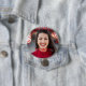 Personalisierter Foto Gedenkknopf, einfaches und modernes Design mit sans-serif oldstyle Not leidendes Schriftart, individuelle Name, Datum und Fotos. Erhältlich in kleinen, mittleren, großen und riesigen Größen, in quadratischen und runden Formen. Keine Mindestbestellung. Roter Text für dunkles Foto. Schaltfläche "Memorandum für personalisiertes Foto"