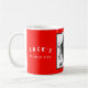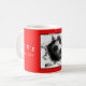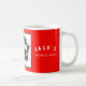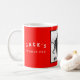 Kreative Fußball-Tasse mit fliegender Fußballkunst auf rotem Hintergrund. Um Text zu personalisieren, fügen Sie den Namen Ihres Lieblings-Fußballspielers, Coaches oder Futbol-Mannschaftssportfans hinzu.