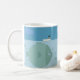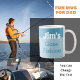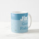 Eine lustige Whimsical Big Fish Tasse. Schöner blauer Himmel und Wasser. Mann in einem Boot mit seinem Angelpol. "Jim's Gone Fishing" - Personalisieren Sie den Namen Ihres Mannes. Dies ist die perfekte Tasse für jemanden, der Lieben Zeit für den großen Seefischen verbringt!