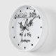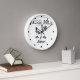 Dieser schwarz-weiße Mr. & Mrs. clock hat zwei Hühner, ein Hahn und Henne in der Liebe. Sie sind Set gegen eine bezaubernde Linie zeichnend Bauernhof. Es kann mit einem Nachnamen oder einem beliebigen Text personalisiert werden, den Sie hinzufügen möchten.