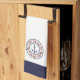 Personalisiertes Kapitän Ankerlogo Küchenhandtuch mit Ihrem Namen und Bootsnamen. Marineblau und roter Kreis emblem auf weißem Hintergrund mit marineblau blauem Rand.