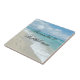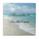 Hübsche und elegante Ozeanszene mit weißem Sand, klarem blauem Wasser und einem hellen blauen Himmel mit puffigen weißen Wolken. Die Fußabdrücke schlendern entlang des Strands. Personalisieren Sie es mit Ihren Hochzeitsdetails oder Flitterwochen Details, oder individuelle Namen für jeden Anlass.