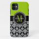 Girly, Limoner grüner Hintergrund, Schwarzweiss-Blumendamastmuster mit einem dekorativen Kreisaufkleber, in dem Sie Ihre Namen- und Monogramminitiale im herrlichen Skript-Schriftart hinzufügen können. Entwurf durch Elke Clarke©2012 für MONOGRAMGALLERY
