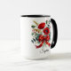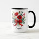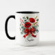 Eleganter personalisierter Becher mit einem schönen roten Mohnblumenstrauß und einem dekorativen Band. Fügen Sie Ihren Namen hinzu, um ein einzigartiges und durchdachtes Geschenk zu erstellen.