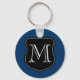 Personalisierter monogramm Schlüsselanhänger mit Briefmarkenschild. Eleganter Anfangsbuchstabe mit anpassbarer dunkelblauer Hintergrundfarbe. Coole Geschenkidee für Jungen und Männer.