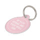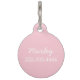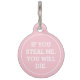 Hübsche Haustier-ID-Tags mit pastellrosa Hintergrund, ein humorvolles Sprichwort "WENN SIE MIR STEHEN, WERDEN SIE DIE", sowie Name und Telefonnummer auf der Rückseite.