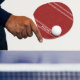 Einfaches modernes Pingpongpaddel in Rot und Weiß mit Spielernamen. Die Vorlage macht es einfach, das Paddel zu personalisieren.