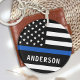 Personalisierter Thin Blue Line Schlüsselanhänger - Amerikanische Flagge in den Farben der Police Flag, modernes schwarz blaues Design. Personalisieren Sie Ihre Bestellung mit dem Namen oder der Abteilung des Referenten. Dieser personalisierte polizeiliche Schlüsselanhänger ist ideal für Polizeidienststellen oder als Gedenkstätte. COPYRIGHT © 2020 Judy Burrows, Black Dog Art - Alle Rechte vorbehalten. Personalisierter Name des Polizeibeamten Thin Blue Line Schlüsselanhänger