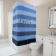 Ein individualisierbares blaues, monochrom gestreiftes Muster für Ihr Bad. Um diesen Duschvorhang zu personalisieren, geben Sie Ihren Namen in das Vorlagenfeld ein. Wenn Sie diesen Duschvorhang ohne Namen drucken möchten, löschen Sie einfach den Namen im Vorlagenfeld. Das Badezimmer ist passend eingerichtet.