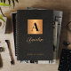 Stilvolles, modernes Monogramm und personalisiertes Notizbuch mit dem Schriftnamen mit einem vergoldeten Imitat-Kupferquadrat aus Metall mit dem Namen Initial und dem eigenen Text auf schwarzem Leder wie (PRINTED TEXTURE) Hintergrund.